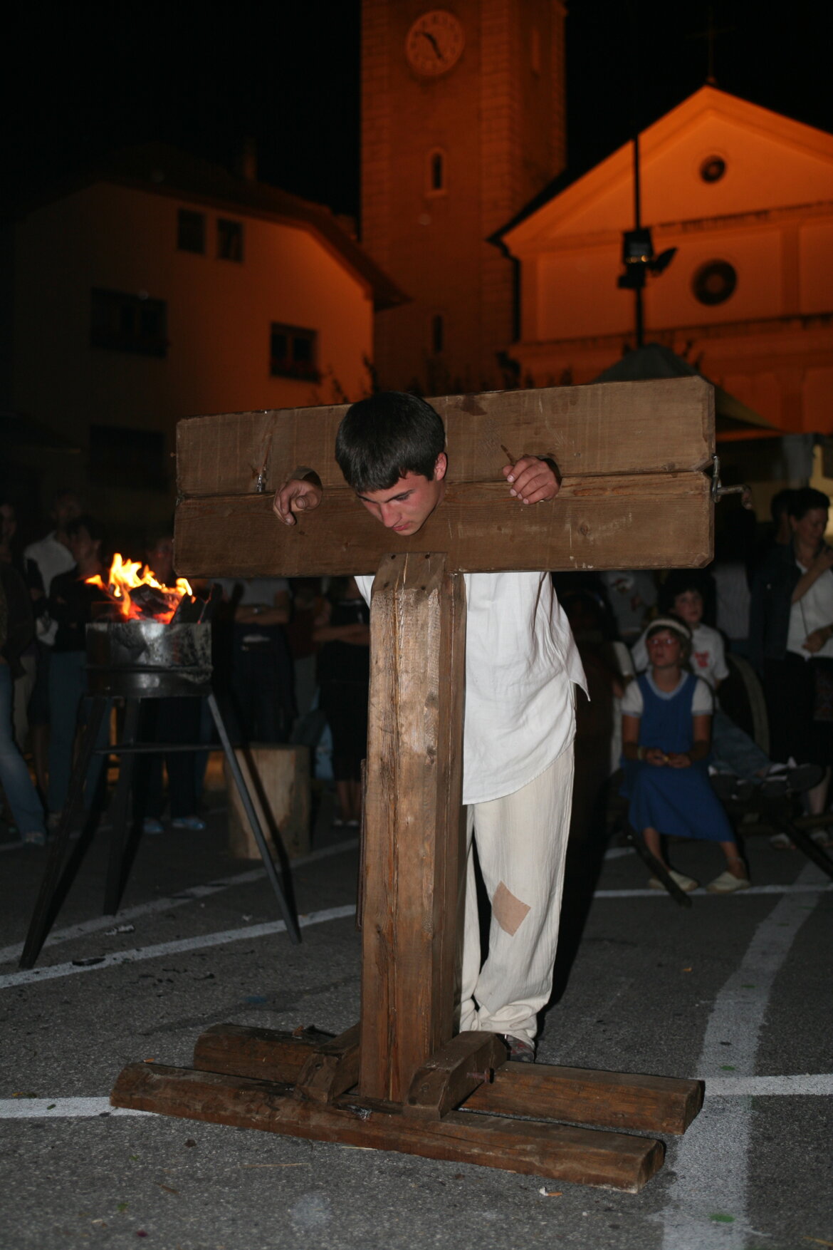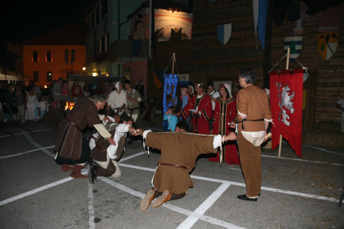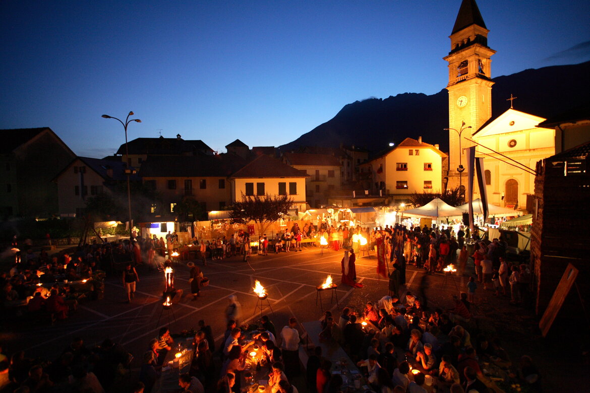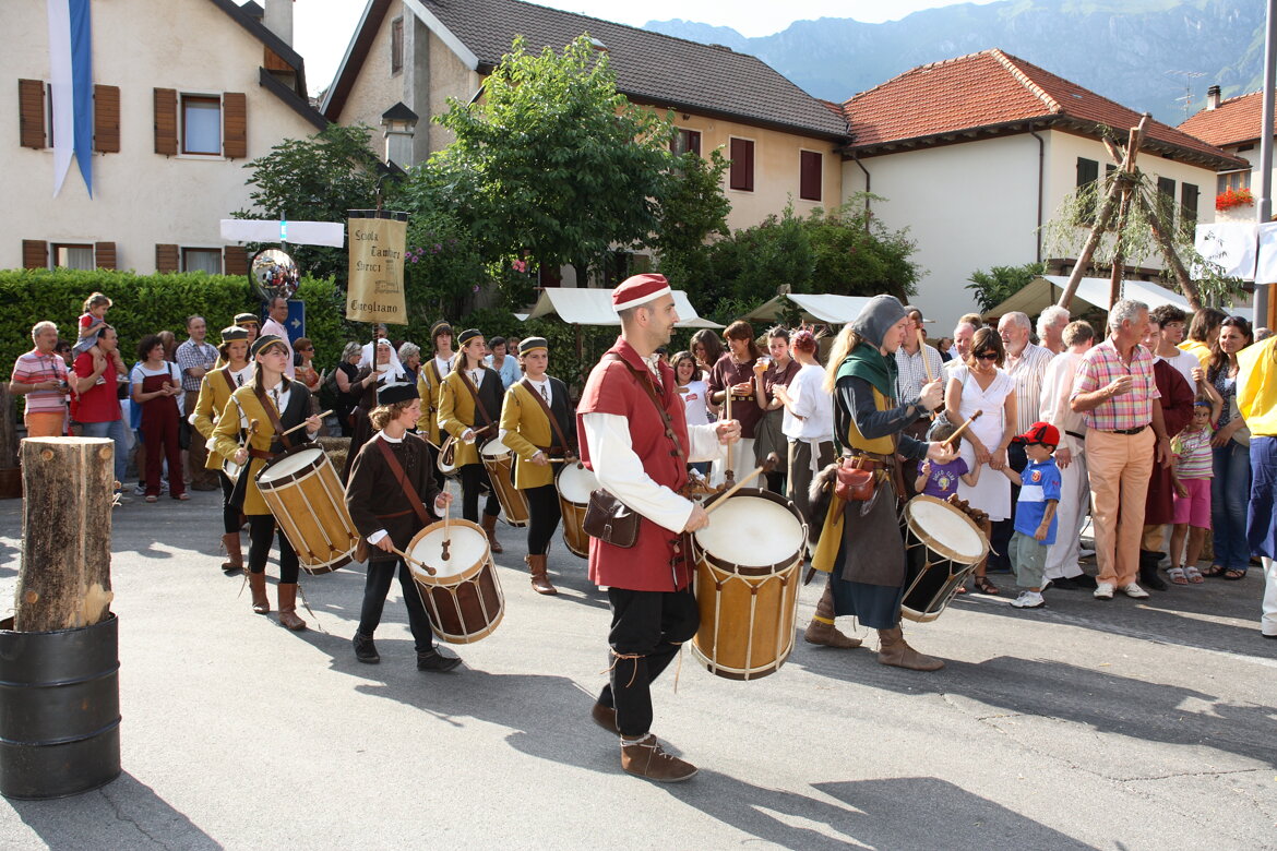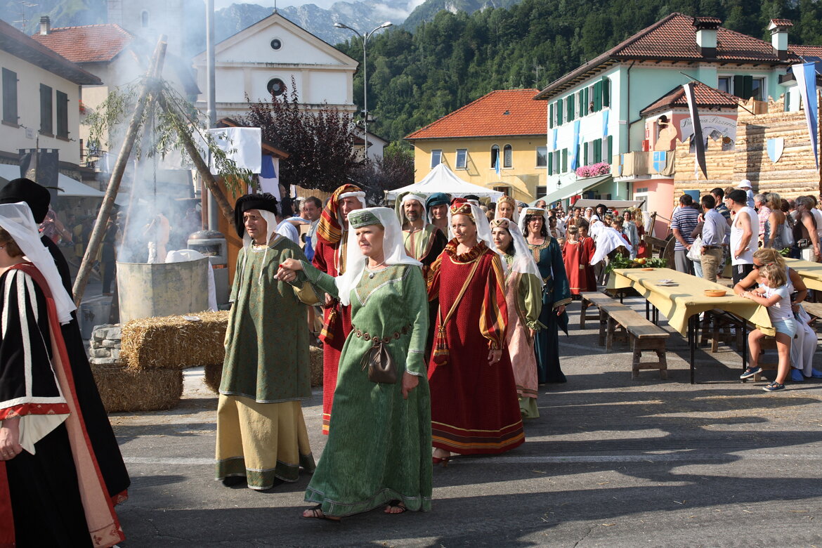 Rievocazione storica per le strade di Lamosano con ricostruzione scenografica in piazza del Municipio dell’antico borgo con mercatino e cantina, cena alla brace con musica e balletti medievali