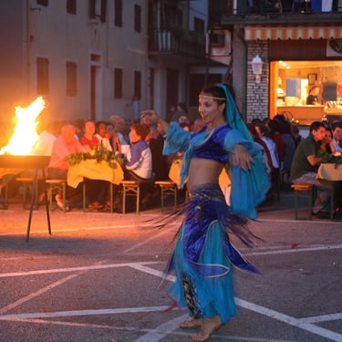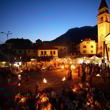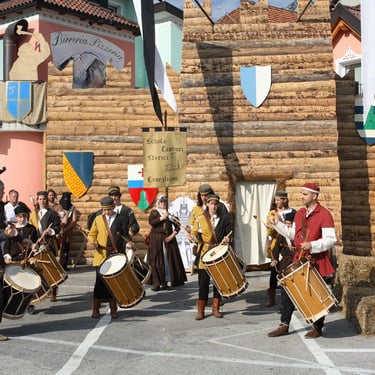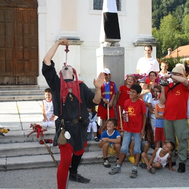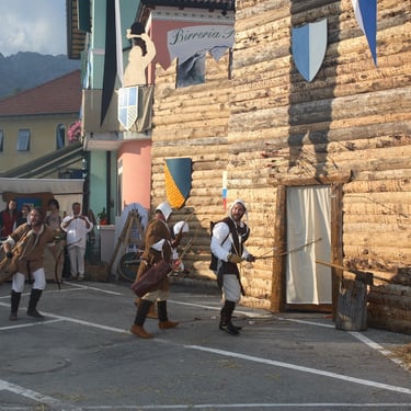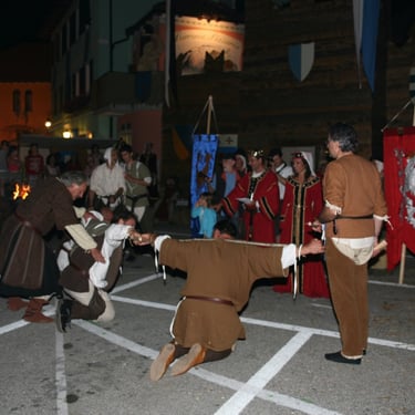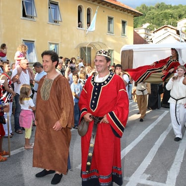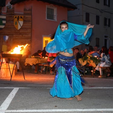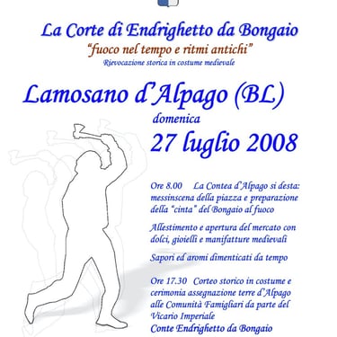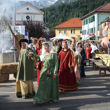Rievocazione storica per le strade di Lamosano con ricostruzione scenografica in piazza del Municipio dell’antico borgo con mercatino e cantina, cena alla brace con musica e balletti medievali
