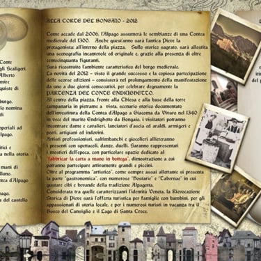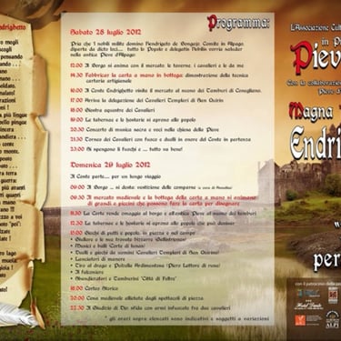Rievocazione storica per le strade di Pieve con ricostruzione scenografica in piazza del Municipio dell’antico borgo con mercatino e cantina, cena alla brace con musica e balletti medievali