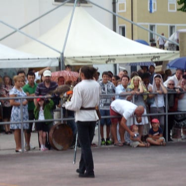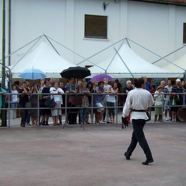 Partecipazione in costume a Pieve d’Alpago della corte di Endrighetto di Bongaio allo spettacolo di falconeria medievale, la corte rende omaggio al borgo e all’antica pieve assistendo al volo.