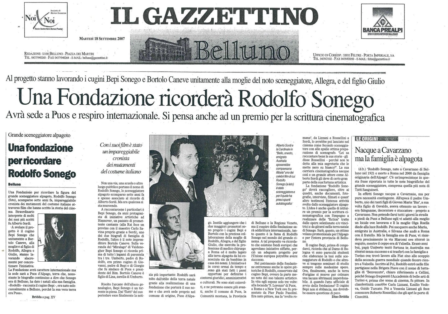 Con l’intento di valorizzare e promuovere la figura dello sceneggiatore Rodolfo Sonego, Forum Alpago, nel 2008, propose alla Regione Veneto un progetto originale ritenuto meritevole di particolare attenzione culturale. L’erogazione dell’importante contributo al Comune di Puos d’Alpago non ha concretizzato, per la Conca, i validi presupposti del progetto, che invece è stato ripreso l’anno successivo, da Lago Film Fest di Revine, con l’istituzione del “Premio Sonego”, il più importante concorso italiano di sceneggiature.